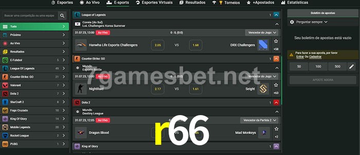 O r66 oferece uma grande seleção de opções de apostas em e-sports com probabilidades competitivas